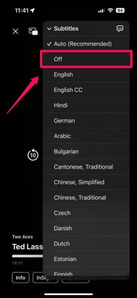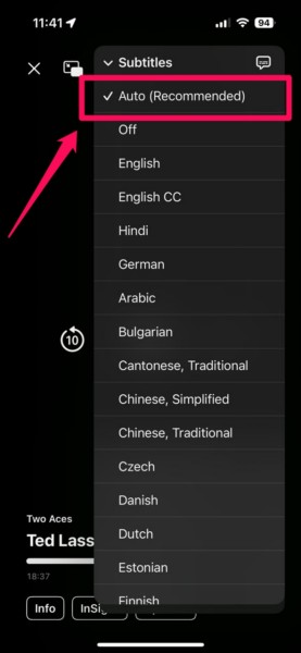 4.现在,在以下菜单上,点击自动(推荐)选项在顶部启用自动字幕功能当前电影或电视节目剧集。 Apple TV 应用程序会记住您的偏好并保持自动字幕启用状态,直到您在设备上将其关闭。
