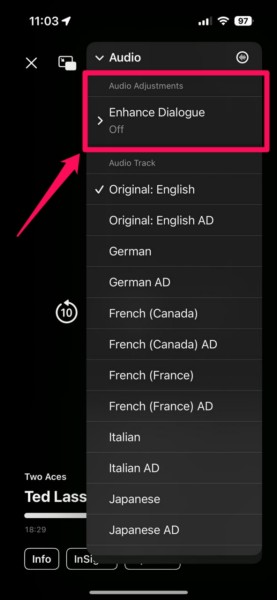 6.如果您想稍后禁用增强对话功能,打开音频设置在播放器内和选择关闭选项根据增强对话部分。