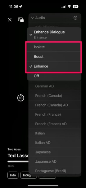 5.在这里,你可以选择任何增强对话选项,其中包括隔离,促进, 和提高。每个选项调整对话音量的方式都略有不同。因此,在选择您喜欢的选项之前,请尝试每一个。