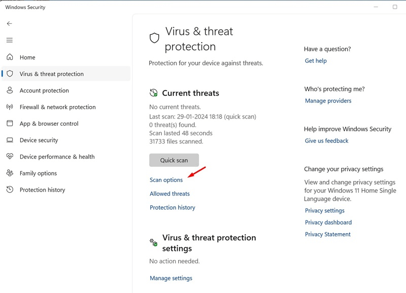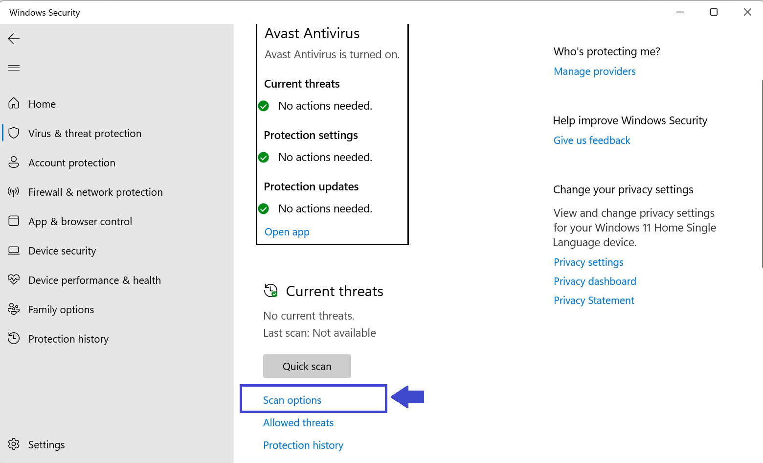 步骤3:在“当前威胁”部分中,选择“扫描选项”。