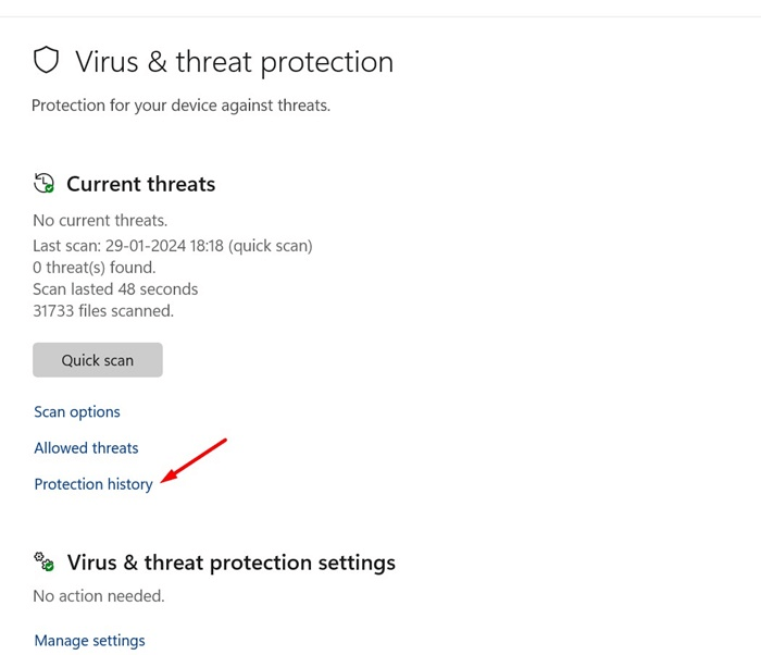 步骤3:在“当前威胁”区域中,选择“保护历史记录”。