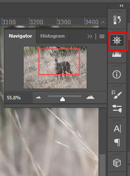 您还可以使用导航器面板在 Photoshop 中放大或缩小图像或画布。通过选择看起来像船舶方向盘的图标,您可以在 Photoshop 屏幕的右侧找到导航器面板。