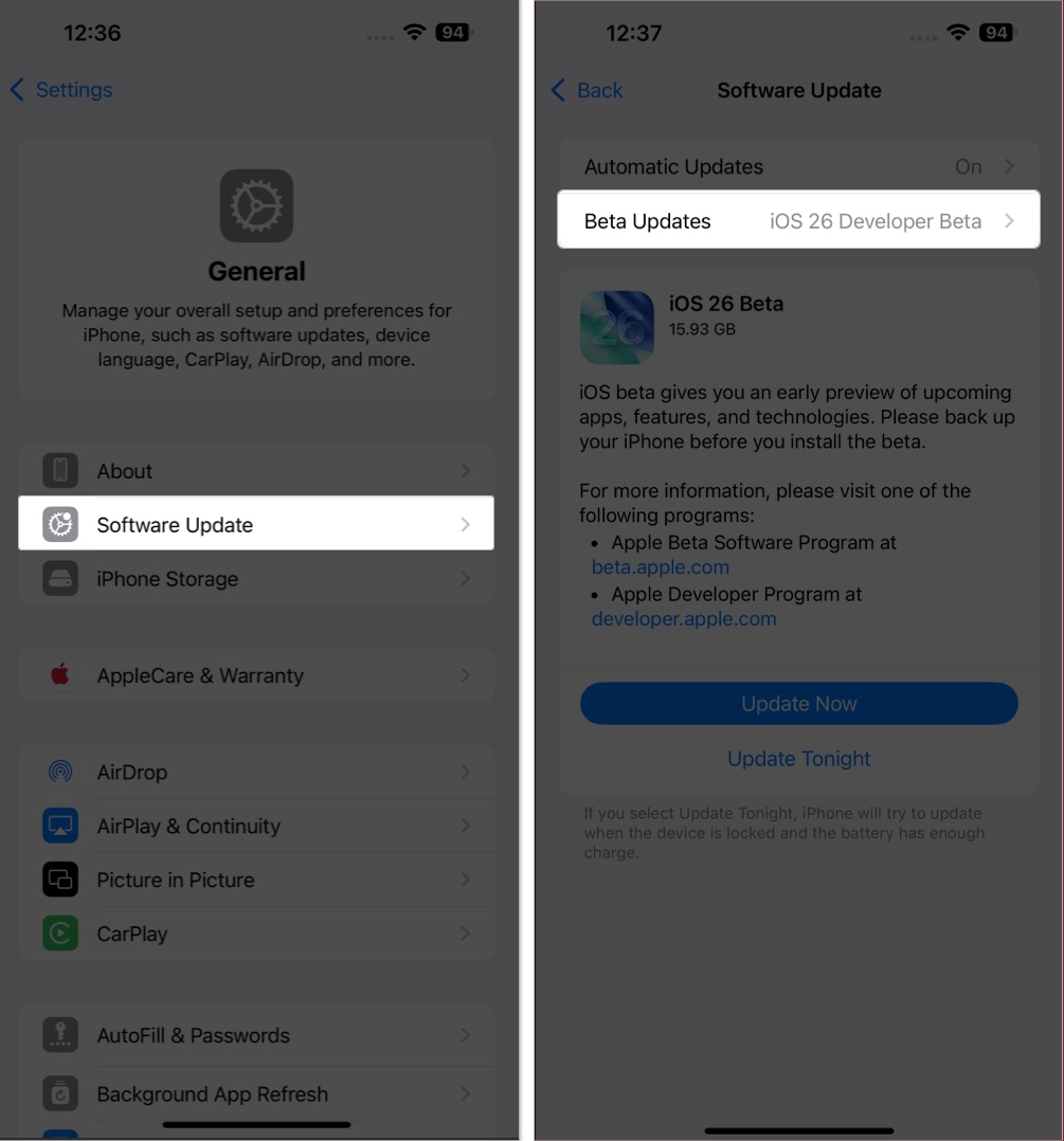 现在,导航至设置>一般的>软件 更新>贝塔 更新,然后选择 iOS 26 开发者测试版。