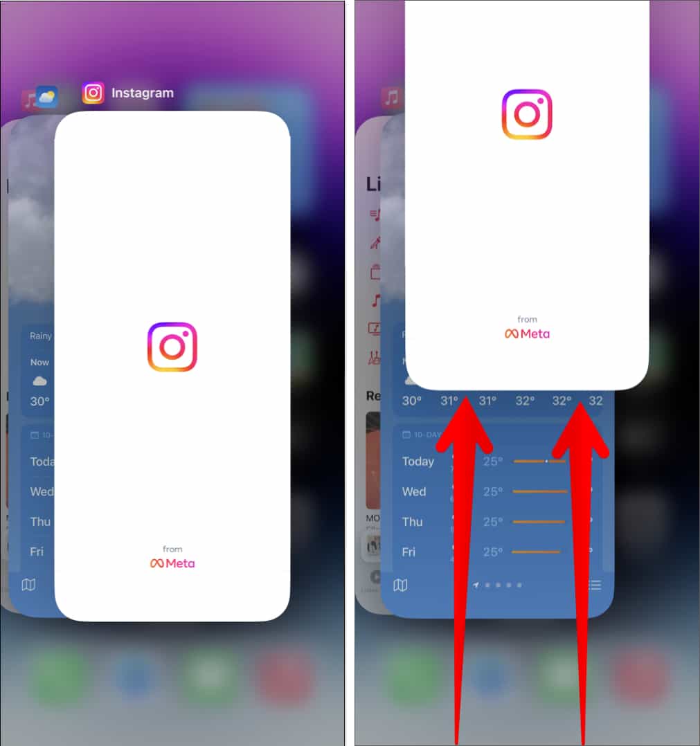 只需向上滑动并按住主屏幕打开应用程序切换器。然后,拖动应用程序窗口向上将其关闭。