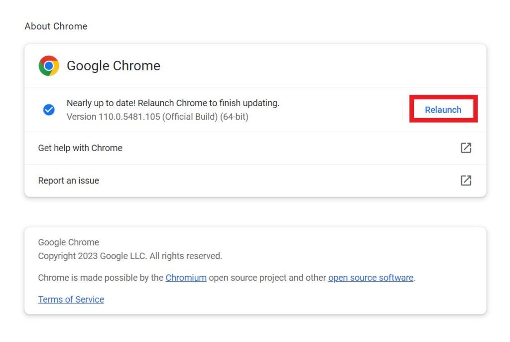 - 安装更新后,单击“重新启动”按钮重新启动 Chrome 并应用更改。