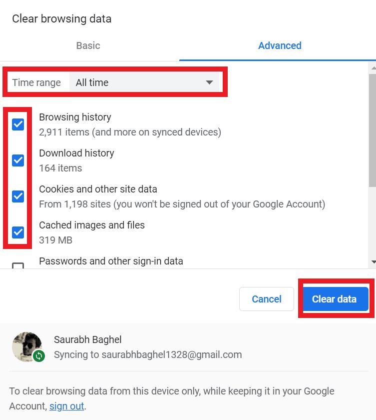 - 您可以使用下拉菜单选择清除特定时间范围内的数据或选择“所有时间”清除一切。