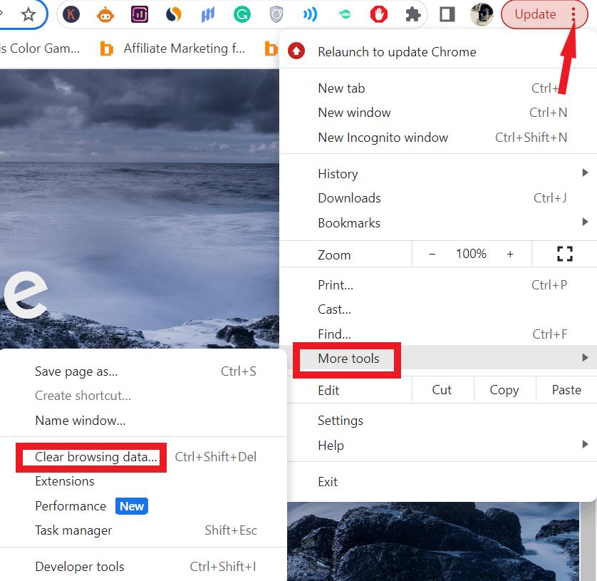 - 从下拉菜单中选择“更多工具”进而“清除浏览数据。”