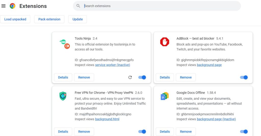 - 您将看到浏览器中当前安装的所有扩展程序的列表。要禁用扩展,只需单击切换开关将其关闭。