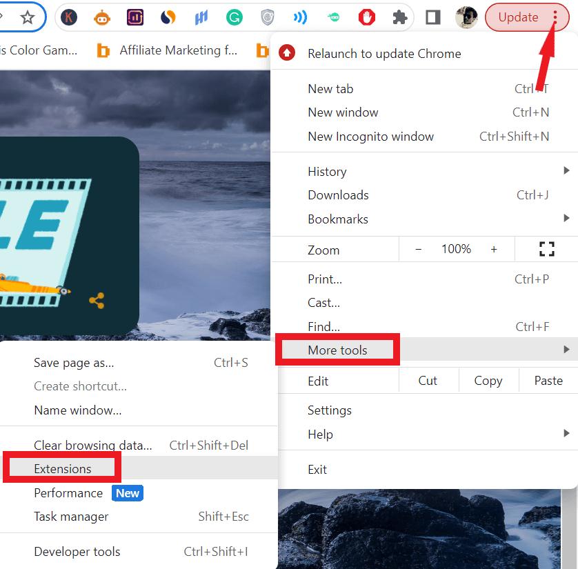 - 从下拉菜单中选择“更多工具”进而“扩展”。