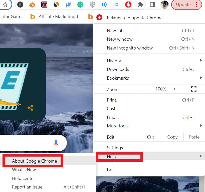- 从下拉菜单中选择“帮助”进而“关于谷歌浏览器。”
