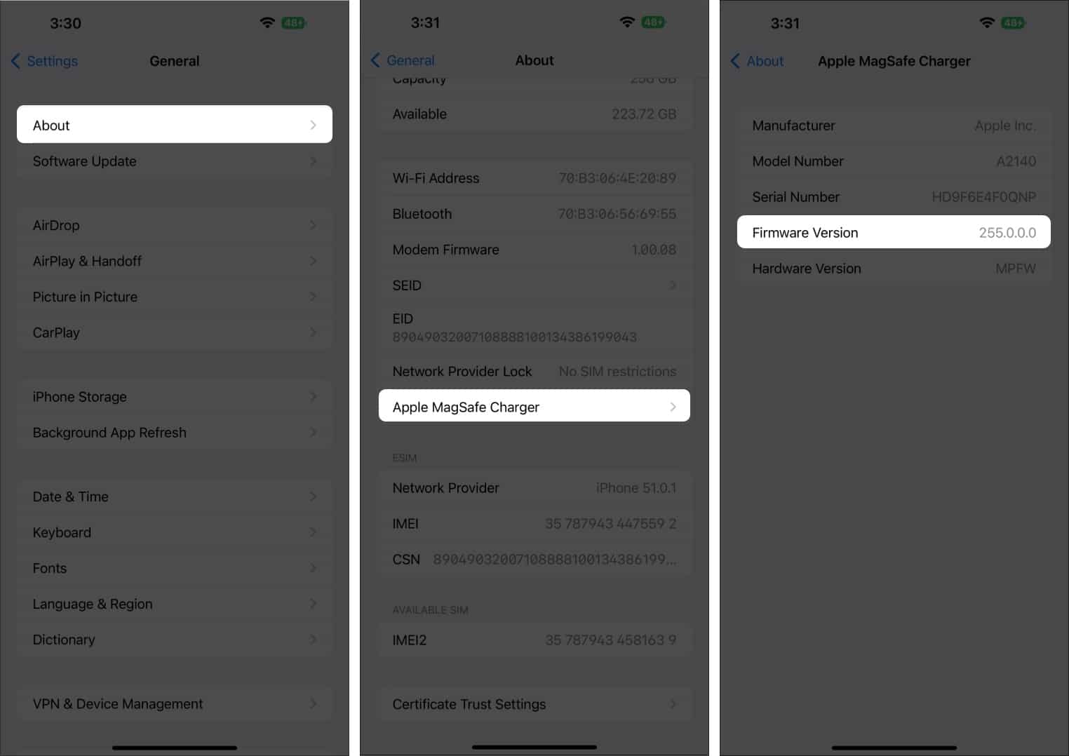 虽然没有确定的方法来下载固件更新,但您可以找到您的 MagSafe 充电器的固件版本和型号。但在继续之前,确保 MagSafe 充电器已连接到 iPhone 并插入电源。