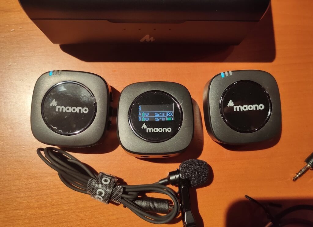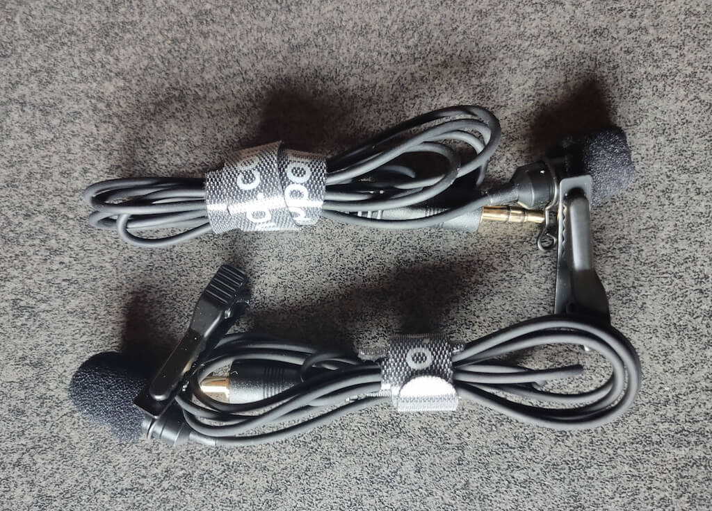 每个发射器都有一个内置麦克风(全向),因此您无需连接领夹式麦克风即可进行录音。但是,如果您更喜欢使用外部麦克风,Maano 套件中包含两个领夹式麦克风。
