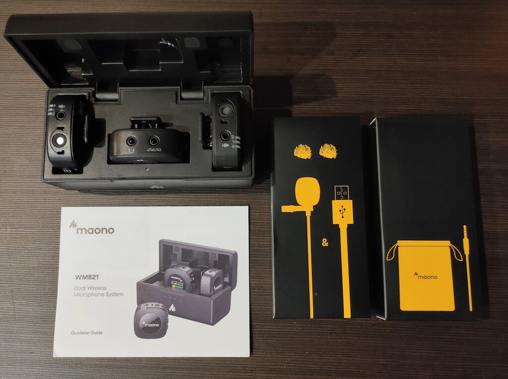 当您第一次打开盒子时,Maano 无线麦克风系统的制作质量就让人感觉非常优质。该套件的各个部件分别包装在带有清晰标签的小盒子中。带接收器的发射器可轻松放入 Maono 充电盒中携带,您可以使用包装中包含的专用便携袋来存放和携带所有配件。