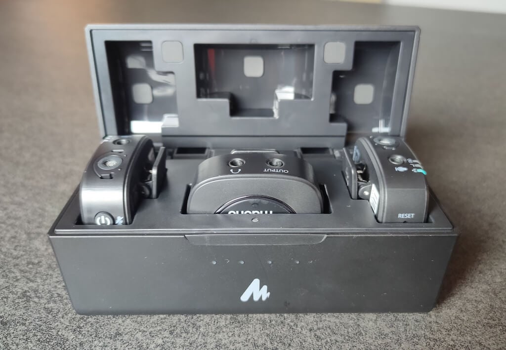我们已经提到过 WM821 的电池续航时间长达 10 小时。据 Maono 介绍,发射器的续航时间甚至更长——一次充电可达 12 小时。借助充电盒,您可以在使用实际充电器之前将这些数字加倍。
