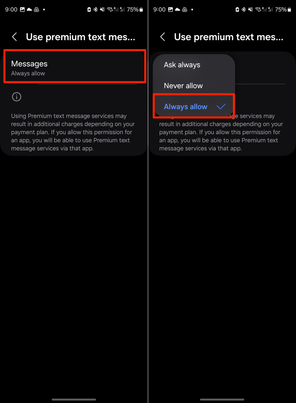 当您发送付费短信时,您是否收到“消息阻止已激活”消息?检查您的手机是否配置为发送和接收付费短信。