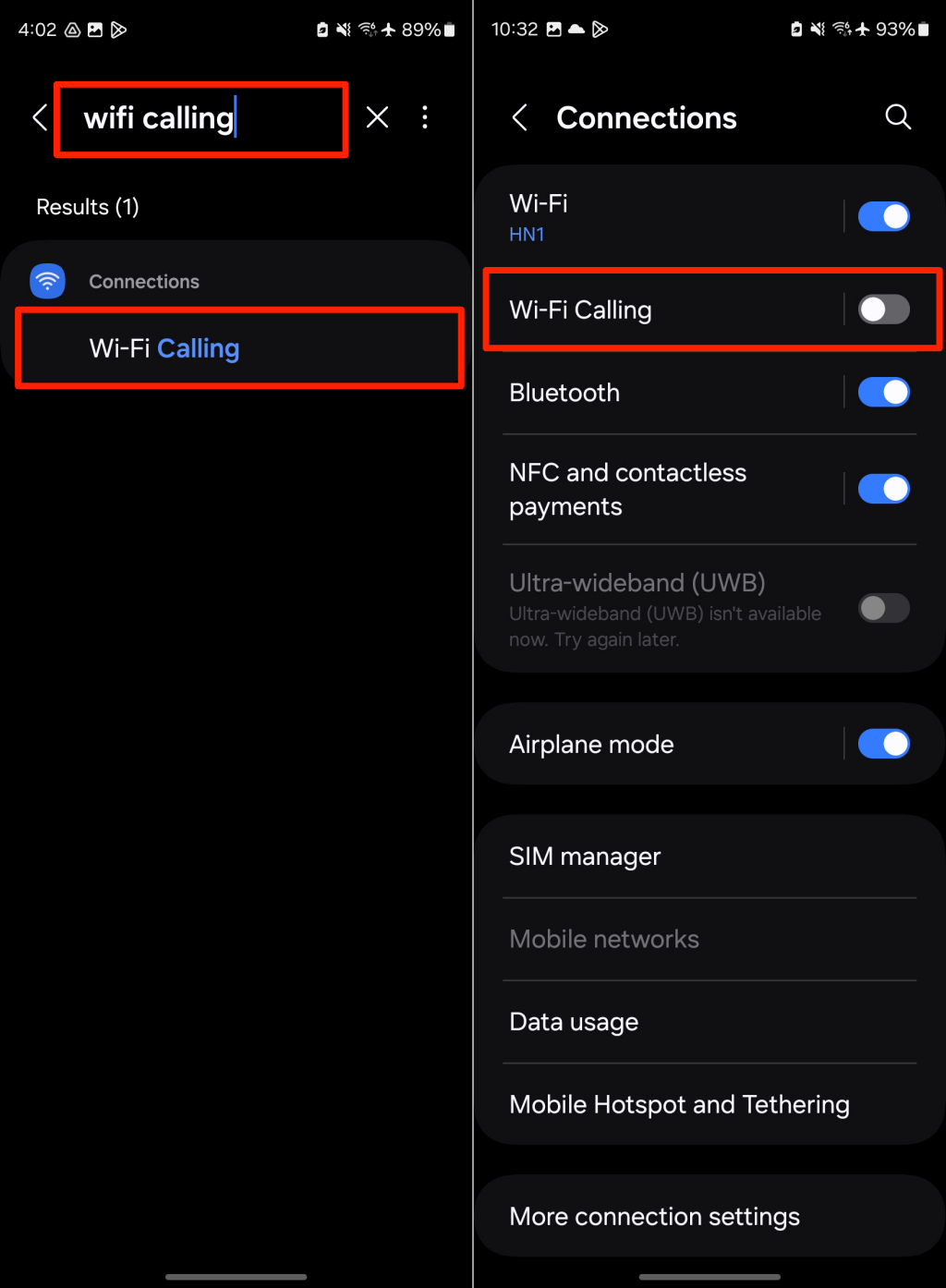 Wi-Fi 通话故障可能会干扰 Android 设备上的短信发送。在手机设置菜单中检查/搜索“Wi-Fi 通话”,将其关闭,然后尝试将消息重新发送给收件人。