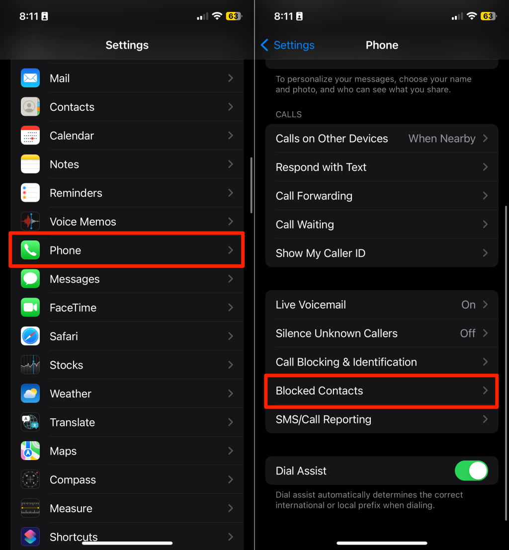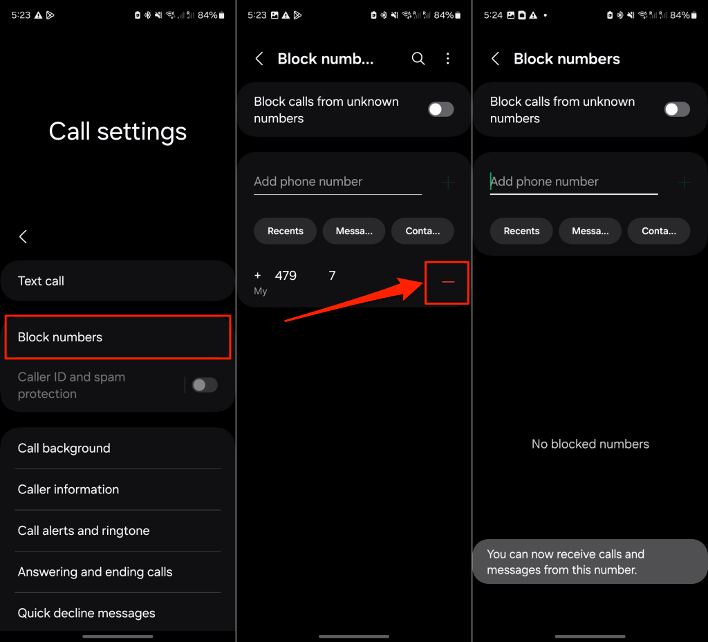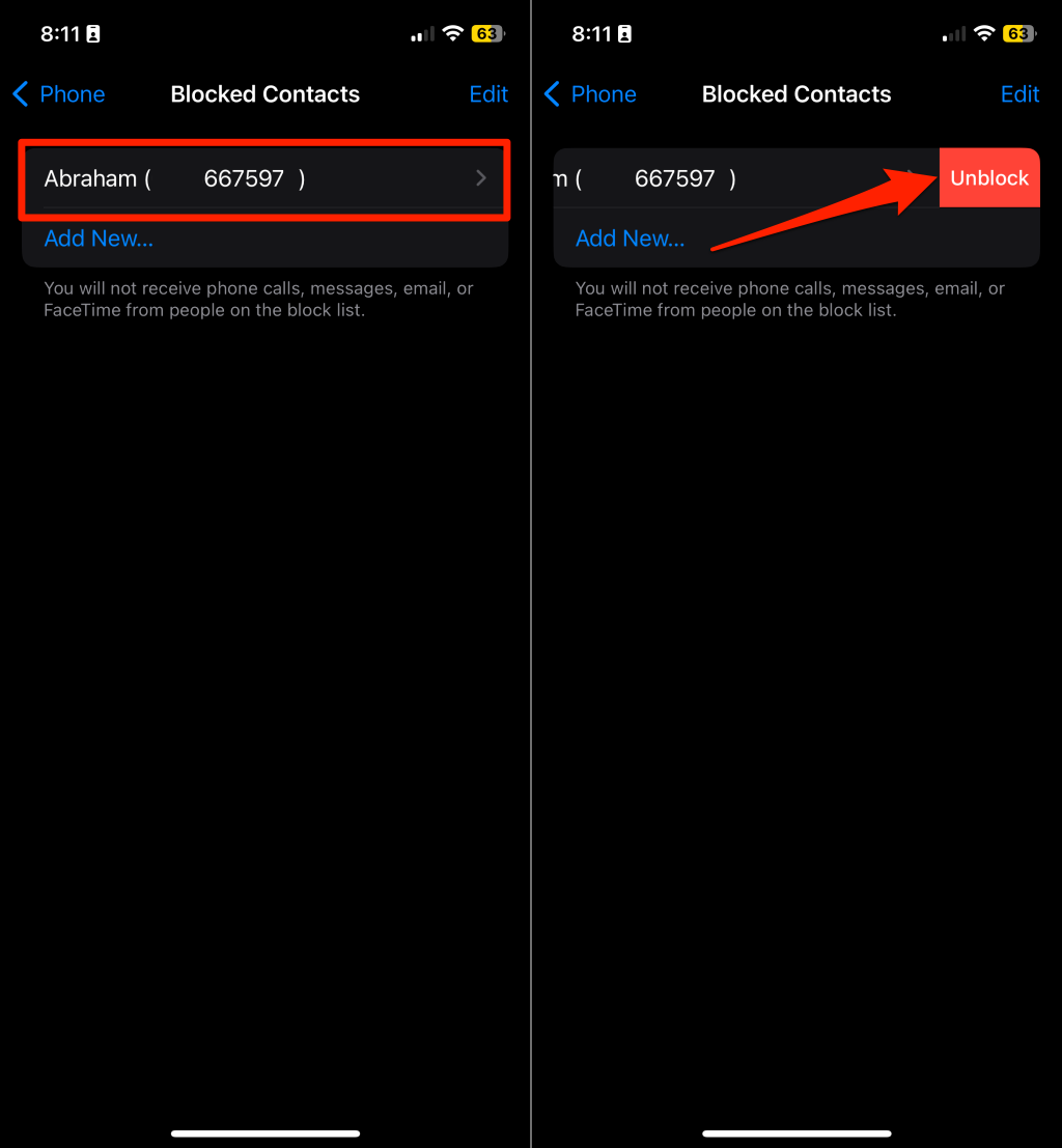 - 如果您发现该人的号码被屏蔽,请点击消除/删除图标旁边的号码以解锁他们。