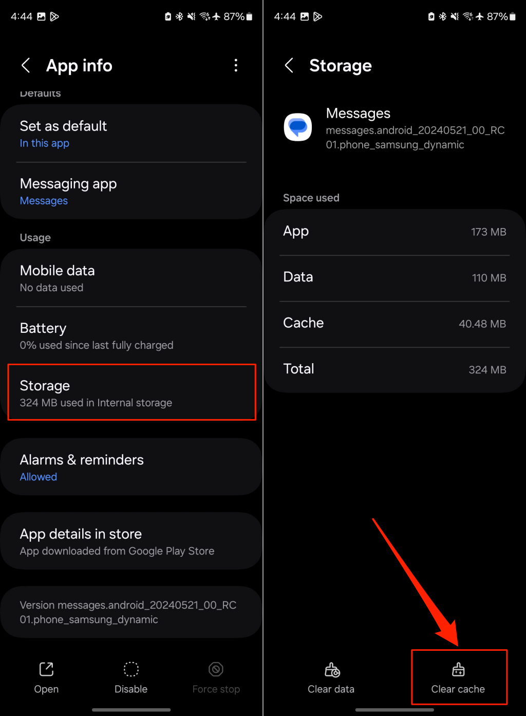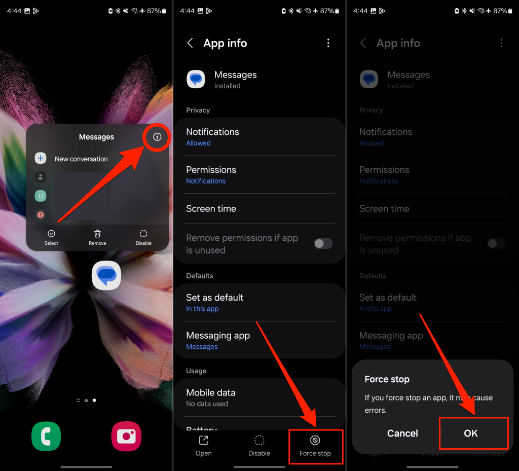 有时,错误消息只是暂时的问题,尤其是在 Android 设备上。强制关闭消息并清除应用程序缓存可以删除阻止消息传递的损坏的临时文件。