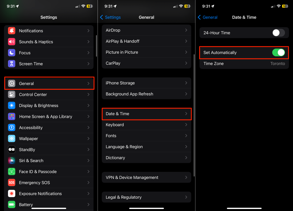 如果您使用 iPhone,请前往设置>一般的>日期和时间并打开自动设置.