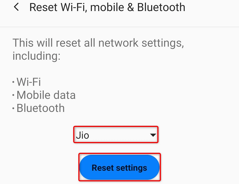 前往设置>系统>重置选项>重置 Wi-Fi、移动和蓝牙。如果您有双 SIM 卡手机,请从下拉菜单中选择受影响的运营商或 SIM 卡,然后点击重置设置.