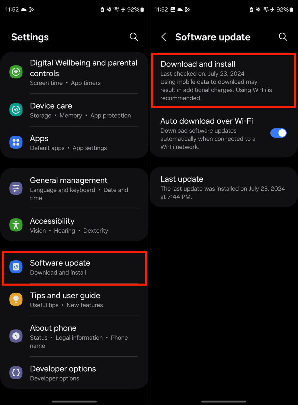 在 Samsung 设备上,请转至设置>软件更新>下载并安装更新他们的软件。