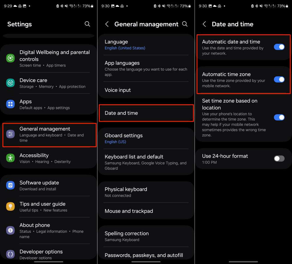 在 Samsung 设备上,请转至设置>综合管理> 日期和时间,然后打开自动日期和时间和自动时区.