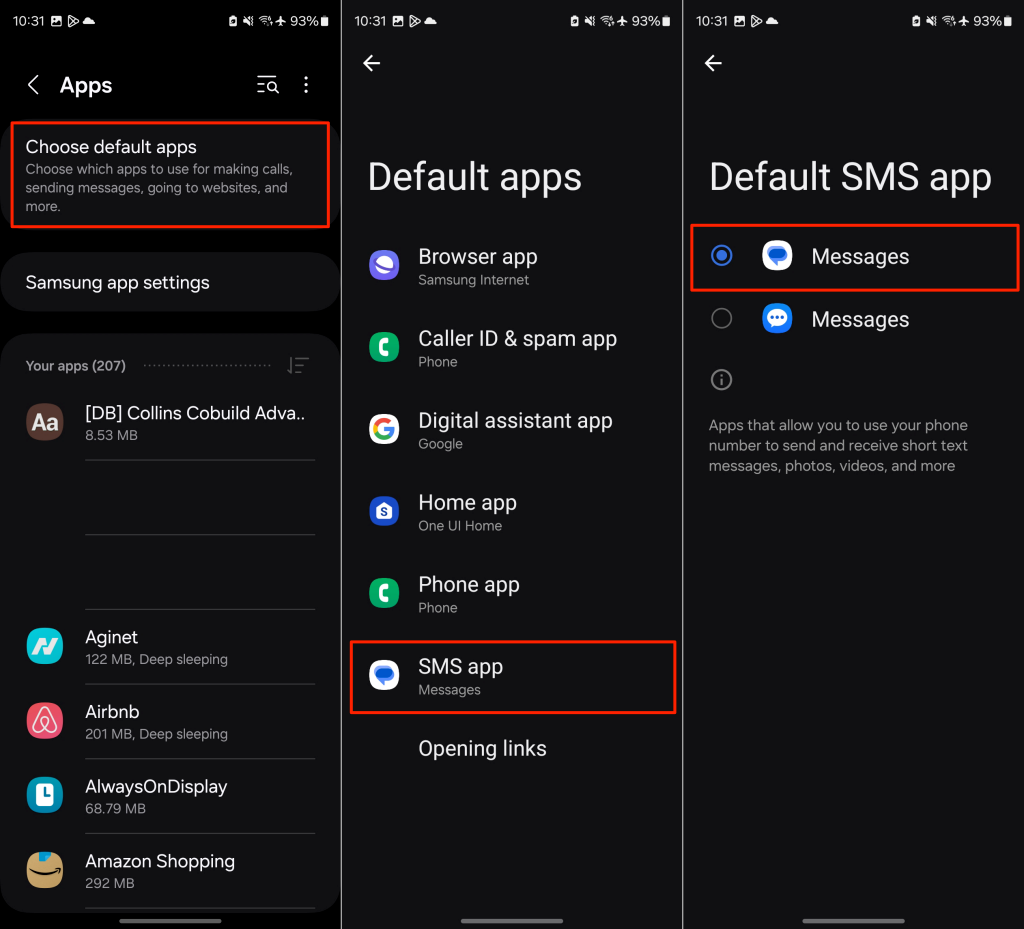 在三星设备上,前往设置>应用程序>选择默认应用程序>短信应用程序并选择谷歌消息图标.