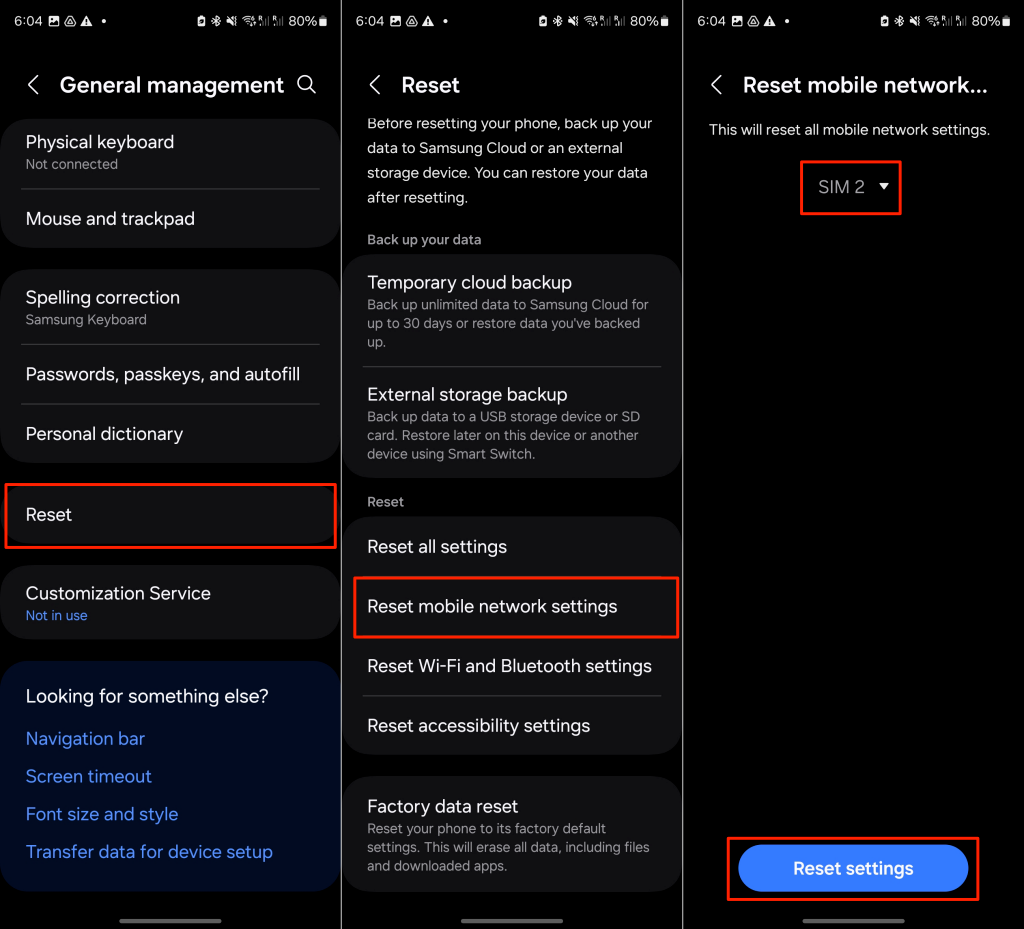 要重置 Samsung 设备的网络设置,请转至设置>综合管理>重置>重置移动网络设置并选择重置设置。如果您的手机有双 SIM 卡,请在 SIM 卡下拉菜单中选择受影响的运营商网络。