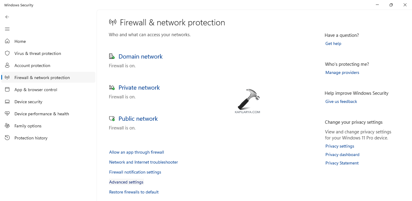 步骤1-首先,打开Windows安全。选择防火墙和网络保护 > 高级设置。