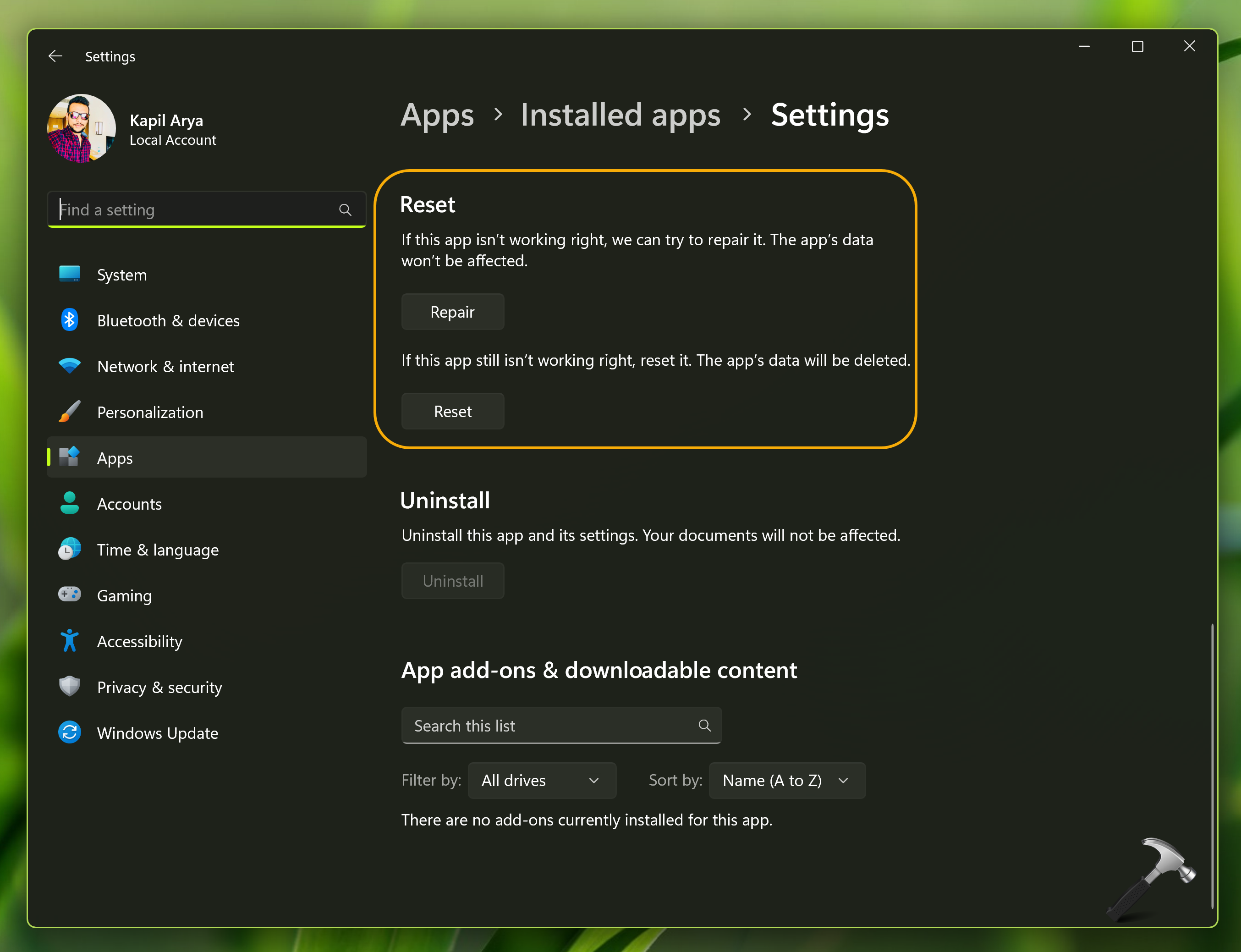 - 这将打开“设置”>“应用程序”>“已安装的应用程序”>“设置”。您可以首先尝试通过点击此处的修复选项来修复应用程序。如果这不起作用,您可以点击重置选项将设置重置为默认值。通过重置,“设置”应用程序数据将被删除。