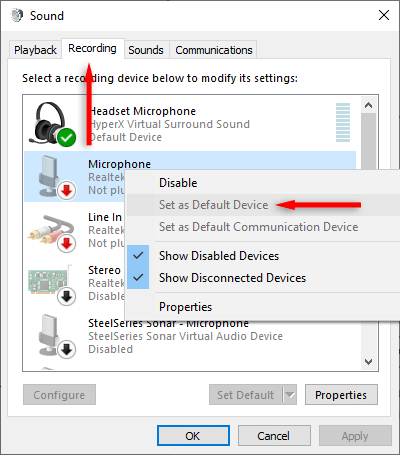- 在录音选项卡,右键单击您的音频设备并选择设置为默认设备。您可以通过选择对输出设备执行相同的操作回放选项卡。