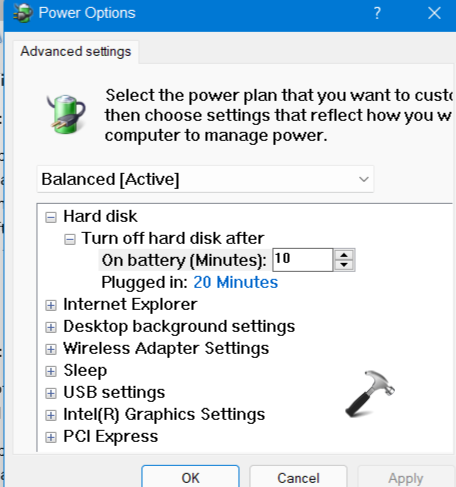 4.在下一个窗口中,转到高级设置选项卡并单击硬盘来扩展它。接下来,单击之后关闭硬盘。从那里,您需要更改时间使用电池(分钟)和已插入。