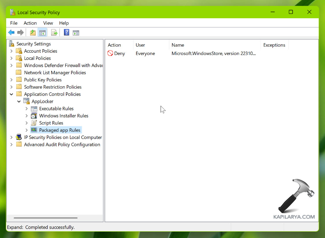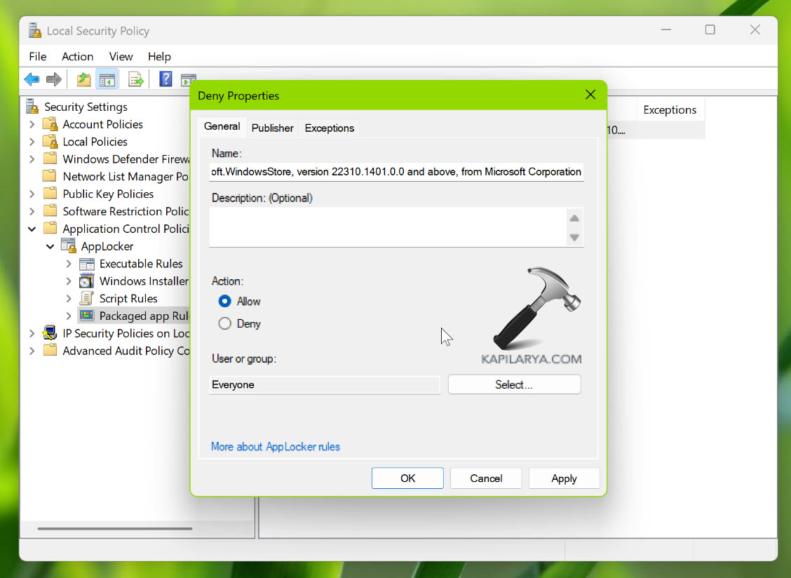一旦您将操作设置为允许单击“应用”,然后单击“确定”,所有人或为此规则配置的用户都将允许使用 Microsoft 商店。请记住,您还可以删除此规则,以便为所有用户启用 Microsoft Store。
