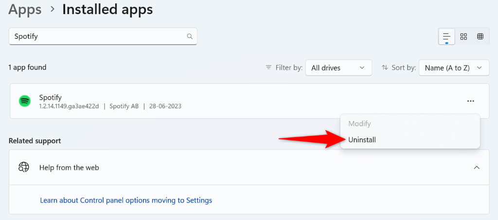 - 在 Windows 11 上,进入设置>应用程序>已安装的应用程序,选择旁边的三个点Spotify, 选择卸载,然后选择卸载。