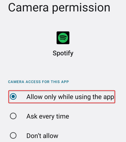如果您尝试使用 Spotify 的搜索功能扫描代码,请确保您已授予该应用程序访问手机相机的权限。这是因为应用程序无法在没有相机访问权限的情况下扫描代码。
