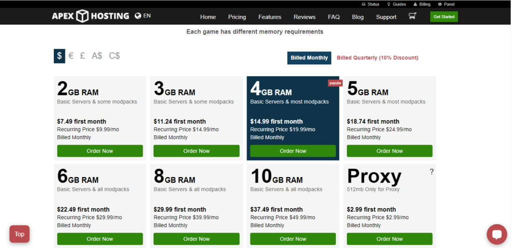 此外,这家 Minecraft 服务器托管公司拥有 24/7 实时客户支持聊天工具。 Apex Hosting 提供 150 个模组包的一键安装,包括 SkyFactory、Pixelmon 和 RLCraft。如果您的预算有限,您可以从每月 2.99 美元的 512 MB 代理服务器开始。