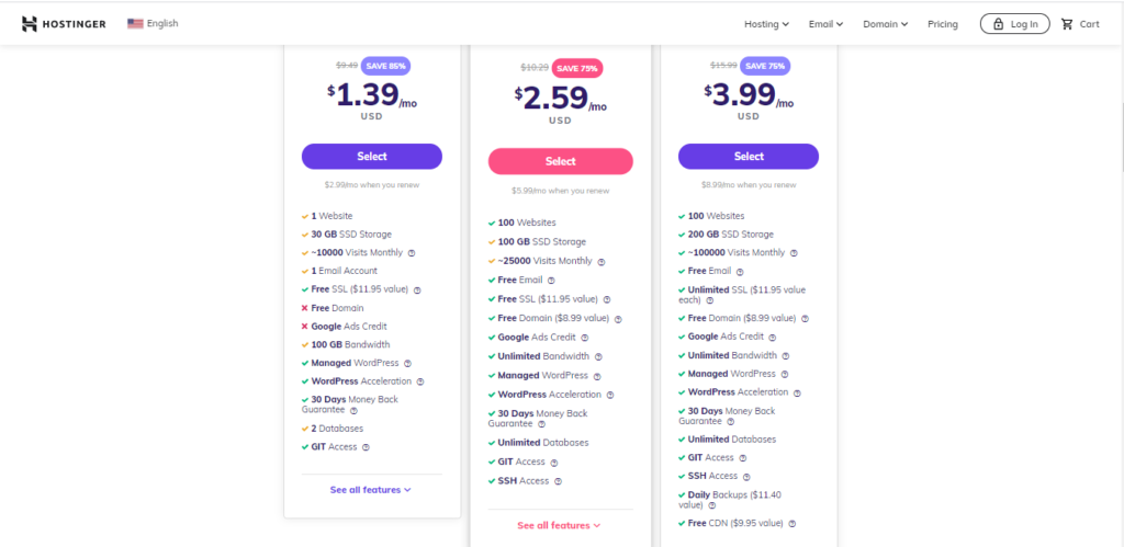 Hostinger 的计划提供 DDoS 保护,并根据其服务级别协议 (SLA) 提供 99.99% 的正常运行时间。因此,他们还提供免费 MySQL、Web/FTP 文件访问以及自动异地备份。