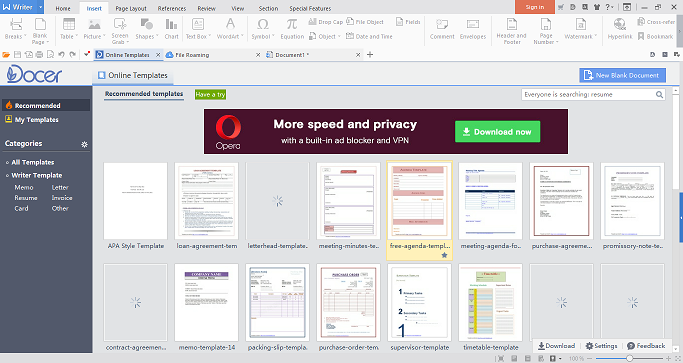 我个人最喜欢这个办公套件的一件事是它有一个默认的免费模板商店对于每个出版商。也就是说,我们可以发现,例如, 简历/简历模板在文本编辑器中或在电子表格编辑器中的经济摘要模板中。所以这个金山WPS Office 2016是顶级的微软 Office 2017 的替代品。