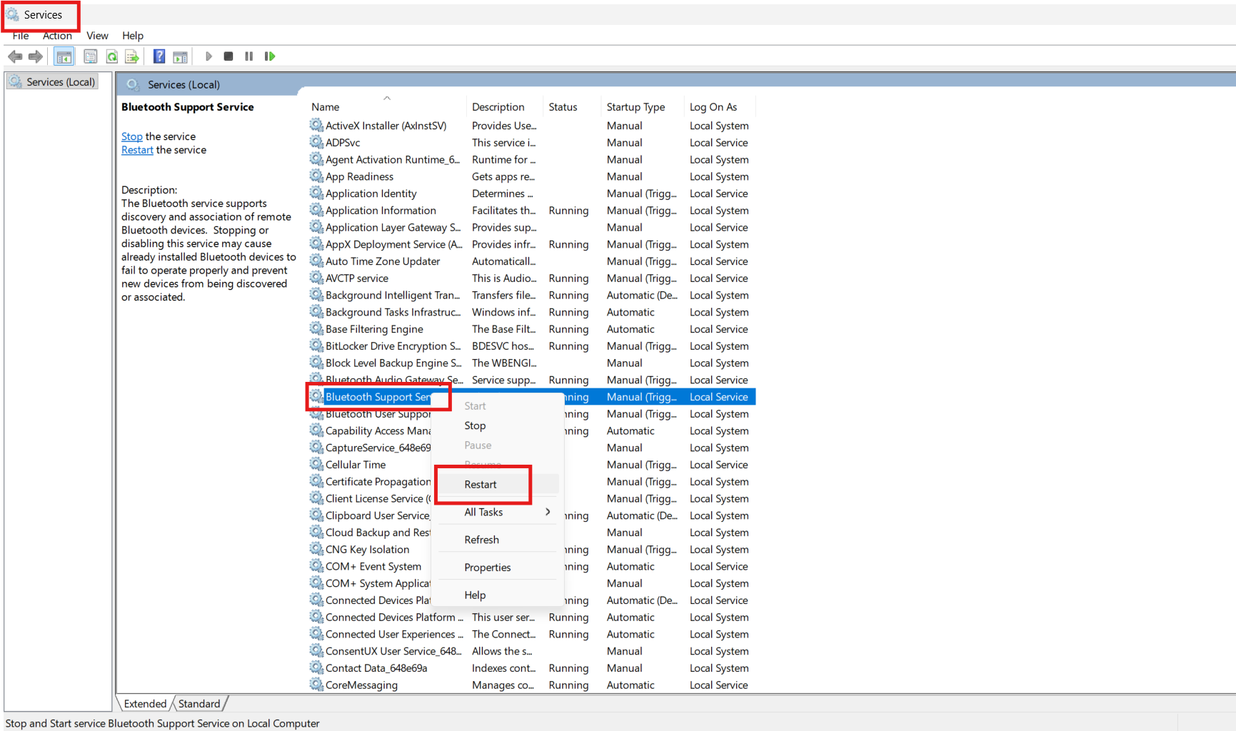 方法5:重新启动蓝牙支持服务