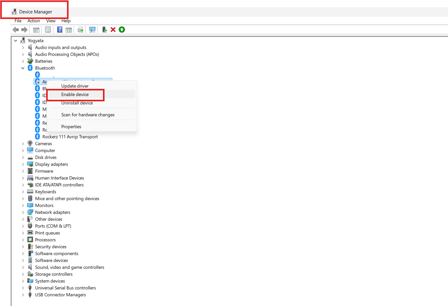 3. 右键单击蓝牙适配器并选择启用设备(或在某些设备中选择更新驱动程序)。
