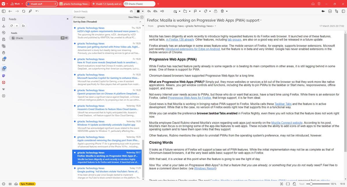 我真正喜欢的一项特别变化是 Vivaldi 现在允许您访问其内置的 RSS Feed 阅读器,而无需设置邮件和日历帐户。是时候了!到底为什么会有这样的要求呢?无论如何,要设置您的源,请转到“设置”>“邮件”>,然后选择“启用源”。现在,切换到 Feed 部分并添加您要订阅的 URL。