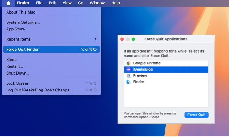 只需单击苹果标志在菜单栏中→强制退出→ 选择应用程序→ 击中强制退出。