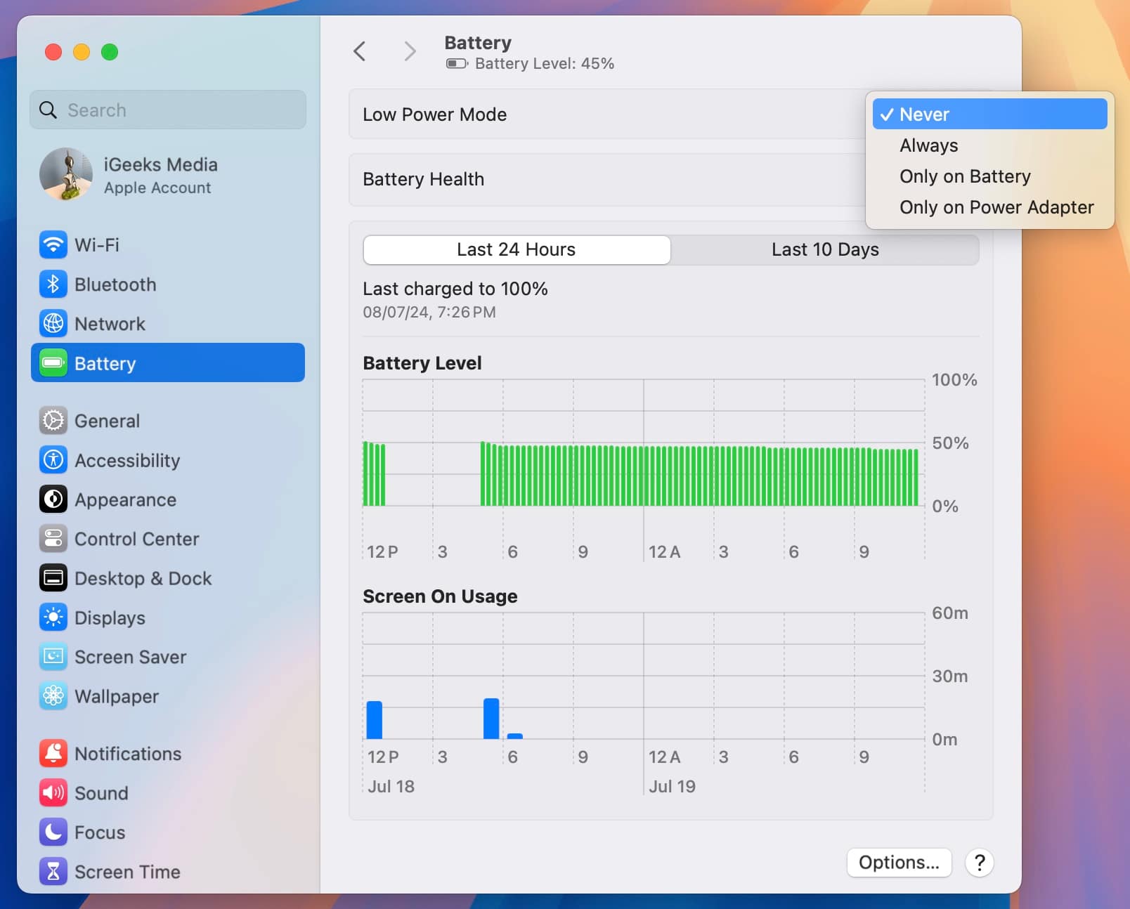 您可以使用 MacBook 内置的节能模式来解决此问题。在此模式下,如果不需要,您的系统将停止任何应用程序在后台运行。要启用低功耗模式: