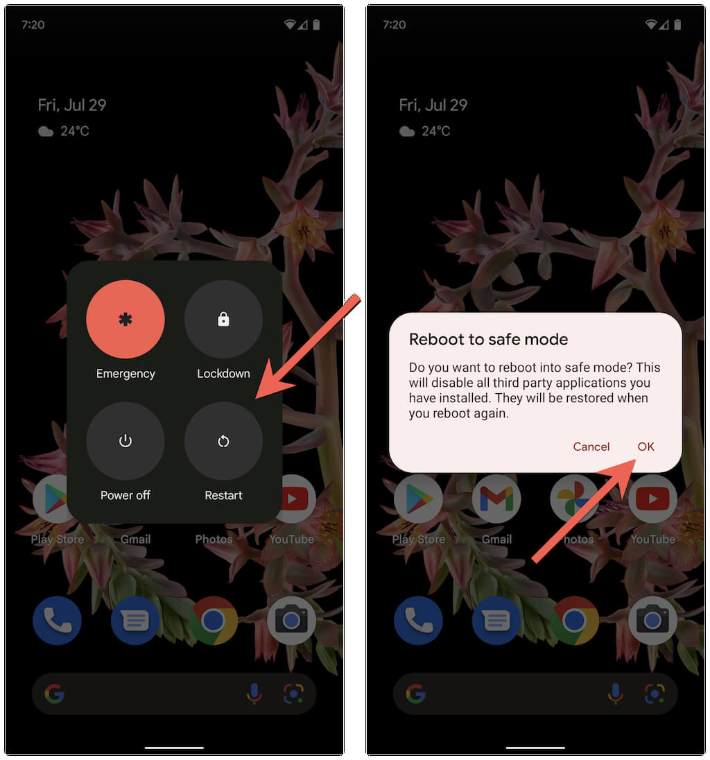 例如,要在 Google Pixel 上进入安全模式,请按力量和调高音量按钮,点击并按住重新启动图标,然后选择好的。