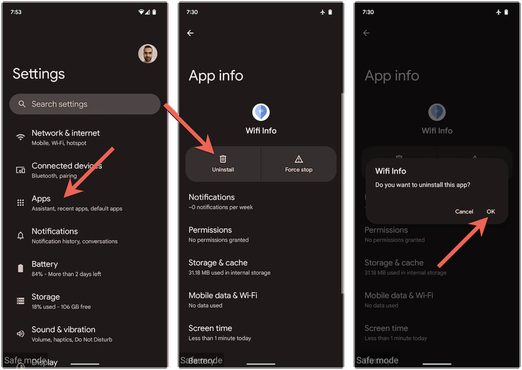 Android 中的安全模式会禁用所有第三方应用程序。如果您的手机不再断开 Wi-Fi 连接,请转至设置>应用程序和卸载所有在正常使用期间可能干扰网络连接的应用程序。