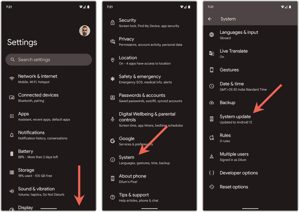 较新的 Android 更新可能包含一个软件修复程序,可以解决间歇性 Wi-Fi 断开连接的问题。要检查并安装系统软件更新,请向下滚动 Android 手机的设置菜单并点击系统>系统更新。