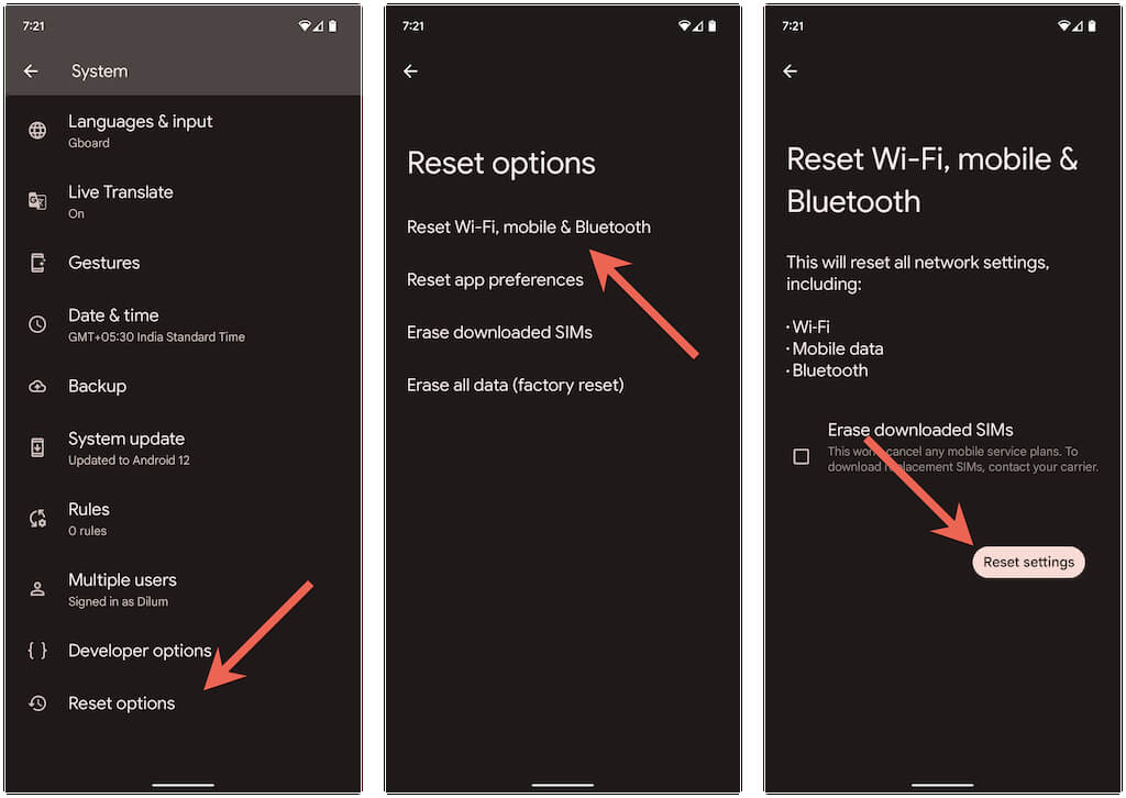 如果上述修复均无效,请重置 Android 的网络设置。这应该可以消除导致手机上出现 Wi-Fi 问题的任何隐藏的连接相关冲突。为此,请转至设置>系统>重置选项并点击重置 Wi-Fi、移动网络和蓝牙>重置设置。