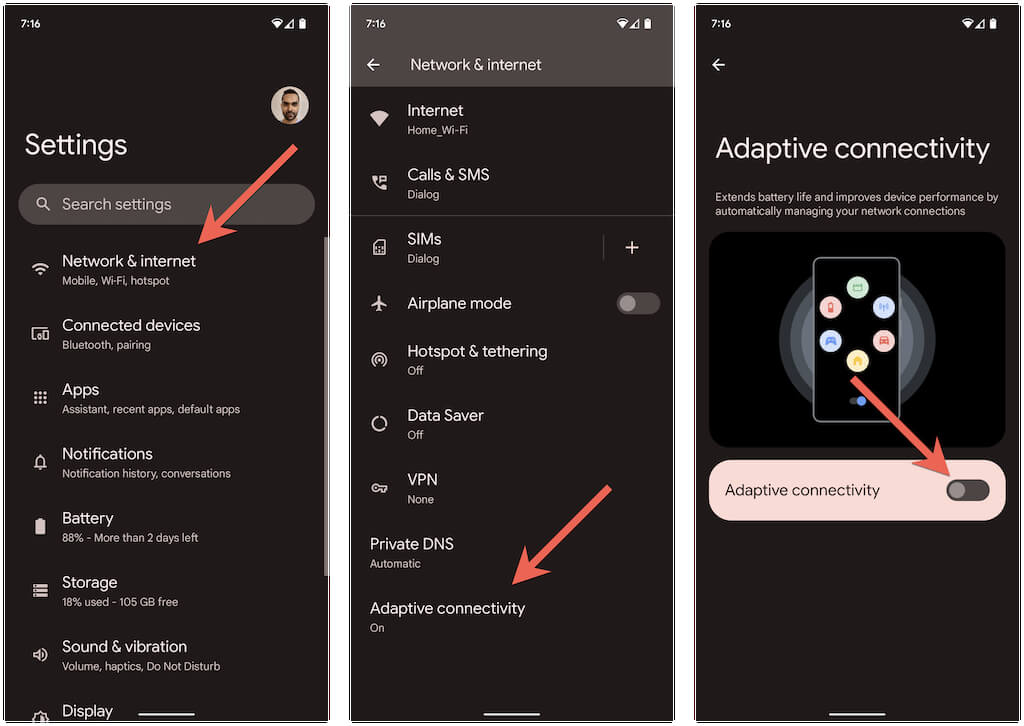为此,请打开设置应用程序并点击网络与互联网>自适应连接性。然后关闭旁边的开关自适应连接性。