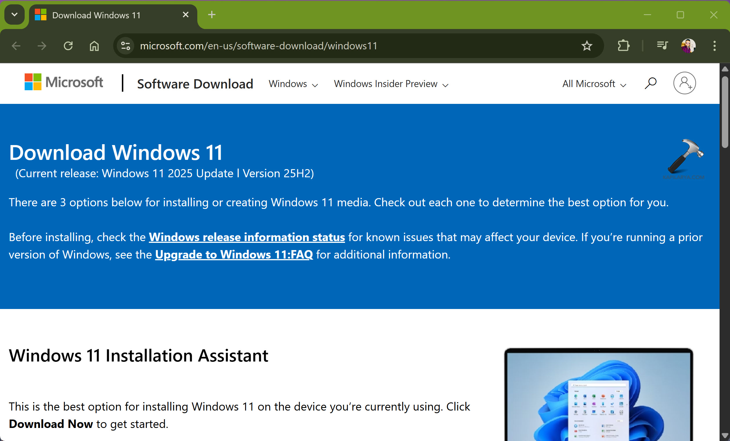 25H2 ISO 版本可从 Microsoft 的公共软件下载网站下载。打开您最喜欢的浏览器并转到https://www.microsoft.com/en-us/software-download/windows11。加载页面后,您会发现当前版本被称为版本 25H2。