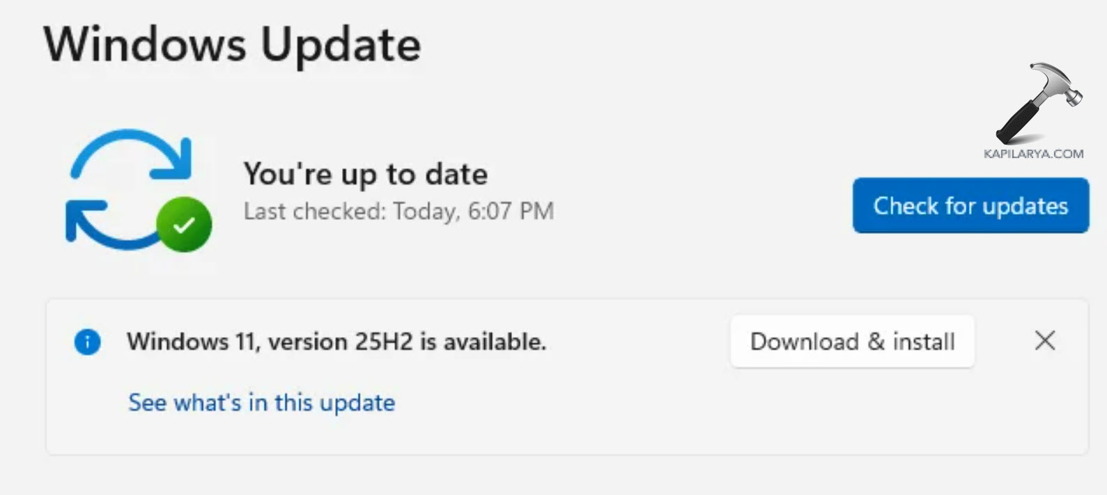 当您转到 Windows 更新页面时,您必须拥有 Windows 11,版本 25H2 可用横幅。单击“下载并安装”按钮,将安装更新。如果横幅仍然丢失,请确保您已打开“一旦有最新更新可用”选项即可获取最新更新。
